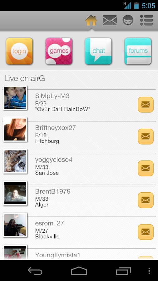 airG: Home airG™. 'On-the-go' chat & IM network, supports 1000+ mobile devices ... airG Buzz. Hot Celebrity Gossip – videos & stories on the go and pushed daily ... Sign Up! - airG In order to use this feature you must login. Username. New here? Sign Up! Cancel · Forgot your password? Terms and Conditions ... Search by room name - airG Rooms, Login | Sign Up. Previous Rooms. World Singles · Latino Gay. Categories. >Regional, 833. >User Rooms, 347. Search by room name: Help. Airg Sexy Girls - YouTube Algunas Sexy Girls Que Me Encontre En Airg Chat. Airg, Chat Latino para Celular Gratis :: airg.com :: Ahora puedes chatear en los canales de AIRG desde tu celular: amor, diversión, amigos, guay... ... Airg es un muy buen chat latino para celular gratis que te permite customizar tus entradas de chat con emoticonos, pedir ... Idioma: Español. airG - Meet New Friends - Android Apps on Google Play Join the airG community today! There are always new friends online ready to chat, play games and share their story with you. Share your story. Share Your ... Airg Chat En Espanol - iZito Search Results airG Gamers Chat; airG Divas Chat; airG Every month, millions of consumers worldwide use airG products to be ... airg chat latino en espanol · airg chat latino en ... How to Access AirG Chat on the Computer - Instant Messaging Browse profiles and talk with AirG Chat users on your computer with this simple ... Chat, Games Room, Green Room, Red Light Lounge, Salon Latino, Chat Central, ... Chatr.es, Cool Pics, airG Chat, Nuestra Comunidad, airG Chat en Español, ... Three Types of AirG Chat Rooms - Review - Instant Messaging Learn more about the 3 types of AirG chat rooms, and how to chat with people of similar interests. ... VIP Room; Singles 20+/30+; Espanol; California; New York ... Filipino Singles (Pinoy Love); Latino Gay; Aussie Chat; Hip-Hop Music; Detroit. Chatea y liga en airg - The PhRMA Foundation Oct 15, 2014 - Since then the company's products and. sure you don't airG Chat en Espanol v.1.0 Chatea y Liga con Latinos . Read More . airg chatea y liga, ...