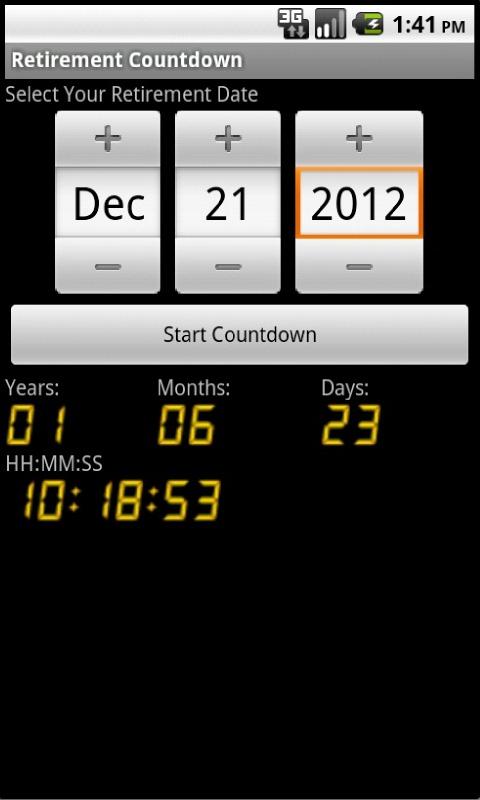 Countdown Timer to Any Date Create a Countdown Timer that counts down in seconds, minutes, hours and days to any date, with time zone support. It also counts up from a past date. Retirement countdown clock - TimeLeft TimeLeft retirement countdown clock tracks how much time is left till the retirement. Just specify the date of retirement and TimeLeft countdown clock will ... Retirement Countdown on the App Store on iTunes - Apple Oct 17, 2013 - Read reviews, get customer ratings, see screenshots, and learn more about Retirement Countdown on the App Store. Download Retirement ... Retirement Countdown - mycountdown Retirement countdown, days until Retirement. Retirement countdown widget, design your own Retirement countdown clock from a range of countdown widget ... Retirement Countdown Clock - Classic - Decorative Clocks Count down the days, hours, minutes and seconds to the better life! The Retirement Countdown Clock stands 3 inches wide x 5 inches tall and comes in a ... Amazon.com: Countdown to My Retirement Clock: Toys ... Countdown clock measures 4 x 2.5 x 2.5; Count down the hours, minutes and seconds with this desktop countdown clock; Reset it over and over through the ... Countdown Calculator: Create a Count Down Timer for ... The Countdown Calculator on this page will create a count down timer to a future event! Simply enter the date and time of ... Retirement. Wedding. So enter your ... Retirement Countdown - Android Apps on Google Play Retirement Countdown - screenshot thumbnail ... Retirement Countdown Easiest way so far for me to track time to retirement .... Final Countdown Day Timer. Retirement Countdown Download - Softpedia Feb 27, 2013 - Retirement Countdown 1.0 - A retirement countdown timer which keeps track of the time until retirement. Top Retirement Countdown Apps - AppCrawlr Retirement Countdown Clock. How long have you been working? How long do you have to work?With this little and smart App you can find out how long it will ...