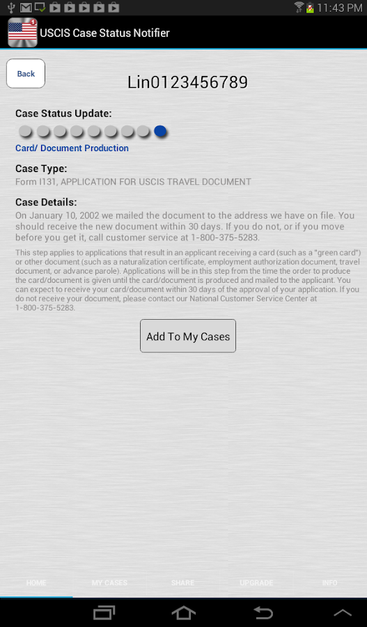 Case Status Online - USCIS Also, sign up for myUSCIS to: • Receive automatic case status updates by email or text message, • View your case history and upcoming case activities, • Check ... USCIS: Homepage United States Citizenship and Immigration Services (USCIS) is a component of the United States Department of Homeland Security ... Check your Case Status. USCIS Case Status Check - Online tracking of ... - Immihelp USCIS Case Status Check - Online tracking of USCIS Case status. Check Immigration Case Status | Homeland Security Sep 17, 2014 - The U.S. Citizenship and Immigration Services (USCIS) My Case Status webpage allows you to see how far along your case is in the ... Check USCIS Case Status Online - Immigration Road Dec 17, 2013 - Immigration Information Center: Visa, Green Card and Citizenship. You can check your USCIS case status online using your application receipt ... How to check USCIS case status online. - Path2usa.com Check your USCIS Case Status online.How to check your visa and immigration application and petition status with USCIS for US Visa or green card. Track USCIS Case Status Online | US Immigration Blog Mar 6, 2014 - Those numbers will help the USCIS customers to check the status of the applications they have filed using USCIS “My Case Status”. USCIS Case Status Check Online with Receipt Number ... http://www.happyschoolsblog.com/uscis-case-status-check-online/ How to check USCIS Case Status Check ... USCIS Case Status - Check Case Status with USCIS gov ... Easy to check your USCIS status online. Enter application receipt number to check USCIS case status or citizenship status with www uscis gov. USCIS Case Status Notifier - Android Apps on Google Play The case status shown here is also available on uscis website. As such ... I really love this app it's help you to check your case easy and quick anytime anywhere.