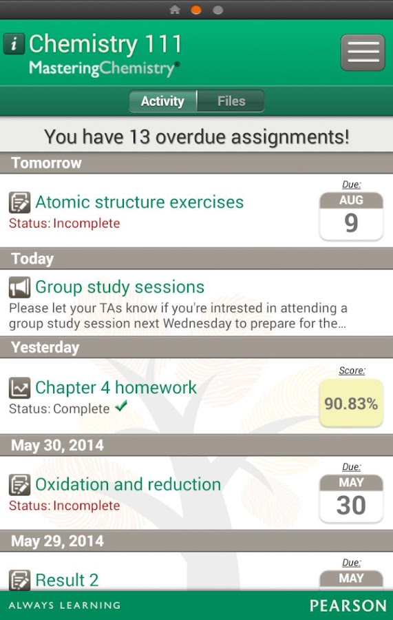 MyLab & Mastering | Pearson Break through to improving results with Pearson's MyLab & Mastering. We're working with educators and institutions to improve results for students everywhere. Students | MyLab & Mastering PEARSON. ALWAYS LEARNING. Help ... Please enter a valid course ID. Copyright © 2011–2013 Pearson Education Inc. All Rights Reserved. Pearson Higher ... Educators | MyLab & Mastering Nov 12, 2014 - Note: This answer only applies to Blackboard 9.1 Service Pack 6 and higher courses using the MyLab & Mastering for Blackboard Learn ... Get Registered 6 days ago - Note: To determine whether a course uses the MyLab & Mastering new design, please see Answer 8703. If you subscribe to this answer you ... Support MyLab & Mastering - Pearson is committed to providing our customers with the most current and effective content and course resources available. MyMathLab Sign in with your Pearson account. Username. Password. Sign In. Forgot your username or password? New to MasteringA&P? Visit our home page to register! IT/Lab Admin Support Blackboard and Pearson have created a solution that combines the proven results of MyLab / Mastering with the power of Blackboard Learn. Pearson's MyLab ... Register | Pearson MyLab & Mastering MyLab & Mastering courses deliver engaging, dynamic learning opportunities suited to your individual progress, to help you arrive at that moment — the moment ... MyLab & Mastering for Blackboard Learn - Pearson 24/7 ... Aug 20, 2014 - We are unable to find iTunes on your computer. To download the free app MyLab / Mastering Mobile Dashboard by Pearson Education, Inc., ... MyLab & Mastering Status: Normal Operation | Pearson 24/7 ... MyLab & Mastering courses deliver a robust, flexible, and intuitive user experience and ... Go to www.pearsonmylab.com or www.pearsonmastering.com. 2.