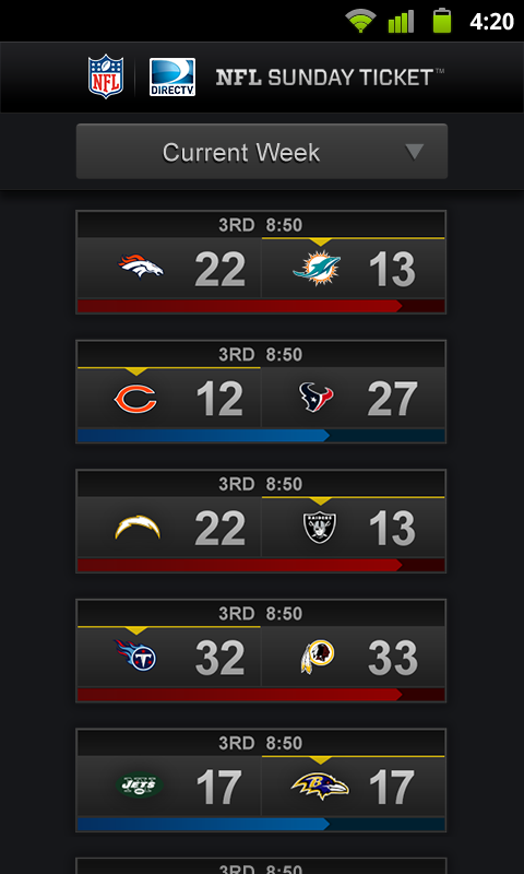 NFL SUNDAY TICKET on DIRECTV - 855-856-4388 Only DIRECTV brings you every play of every out-of-market game, every Sunday. Get the action on your TV with NFL SUNDAY TICKET. Or up your game to NFL ... NFL Sunday Ticket Online Streaming | DIRECTV Now you can stream every live, out-of-market NFL game every Sunday, on your favorite device without a DIRECTV satellite TV subscription. NFL Schedule | Football Games Available on NFL SUNDAY ... Check our NFL schedule for football games available on NFL SUNDAY TICKET from DIRECTV. Then watch the best Sunday football games online, at home, ... DIRECTV NFL SUNDAY TICKET App - Get the NFL Mobile ... Get the DIRECTV NFL SUNDAY TICKET mobile app and get your out-of-market NFL games to-go! Catch every snap, every Sunday on your phone, tablet or ... What is NFL SUNDAY TICKET MAX? | DIRECTV Support With NFL SUNDAY TICKET MAX, you can get live game streams, highlights, scores and stats on your computer or mobile device, plus additional enhanced ... Try DIRECTV's new NFL Sunday Ticket App Get even more of what you love about NFL Sundays with the amazing NFL SUNDAY TICKET APP. Track your NFL.com fantasy league team, keep tabs on your ... NFL Sunday Ticket - NFL.com Only DIRECTV brings you every play of every out-of-market game, every Sunday. Get the action on your TV with NFL SUNDAY TICKET. Or up your game to NFL ... NFL, DirecTV extend NFL Sunday Ticket in multiyear deal ... Oct 1, 2014 - The National Football League and DirecTV have extended and expanded DirecTV's exclusive rights to carry NFL Sunday Ticket and its ... DirecTV to offer NFL Sunday Ticket streaming options - NFL ... Jul 17, 2014 - NFL Sunday Ticket has long been the sole propriety of DirecTV's dishes. Now the satellite company will begin offering online streaming option ... NFL Sunday Ticket - Android Apps on Google Play Use of the DIRECTV NFL SUNDAY TICKET® app by DIRECTV customers is subject to DIRECTV's Customer Agreement and Privacy Policy (available on the ...