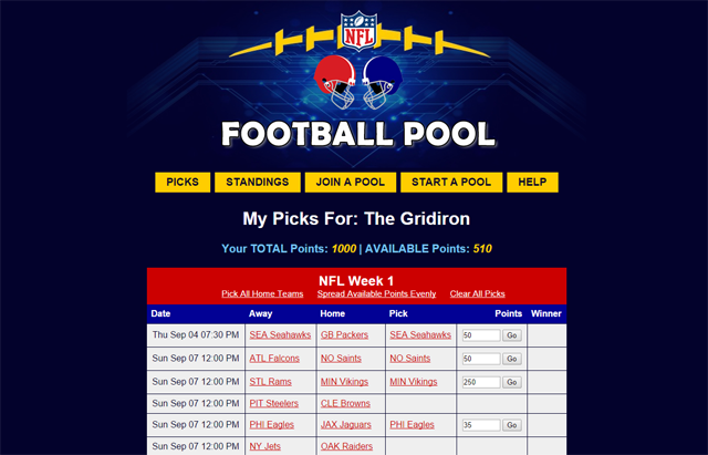 Log In - Office Football Pool Hosting :: Pro and College ... Log In Page. Log in to your account to view this page. Trouble Logging In? Forgot my password · Password FAQ · Take the Cookie Test (What is this?) ... My Account www.officefootballpool.com. MENU. Close. Close. Picksheet. Log In to Your Account. User Name. Password. Remember my Password. Not a Member Yet? Log In Page Custom pools for the NFL, golf, and baseball. Includes team statistics, game research, and free prizes. Picksheet - Office Football Pool Hosting :: Pro and College ... You can be managing your own pool in four easy steps: 1. Select your pool format; 2. Name your pool; 3. Customize your settings; 4. Invite your friends to join. Office Football Pool Hosting :: Pro and College Football ... Is there a mobile version of your website? - Yes! Our site is fully functional on your cell phone browser. Our special mobile edition contains the most popular ... Pools - Office Football Pool Hosting :: Pro and College ... COLLEGE BOWL PICK'EM: Pick your teams to win (or cover the spread) each week. As pool manager, choose which of the bowl games to include on your ... FAQ - Office Football Pool Hosting :: Pro and College ... Sign Up · Log In · Mobile · Find Friends · Badges · People · Pages · Places · Games · Locations · About · Create Ad · Create Page · Developers · Careers · Privacy ... Football Pool Hosting - Office Football Pool officefootballpool.com · October 2, 2012 ·. Since week 4 provided the first bye week of the 2012 NFL season, now is probably a good time to discuss how teams ... Profile Pictures - officefootballpool.com | Facebook As difficult as things were for hapless Green Bay last night, things might get more difficult on Sunday at home against New Orleans. Although the Saints... October 2, 2012 - Facebook Welcome to Office Football Pool.com (OFP), owned and operated by OFP Hosting, Inc. OFP provides its service to you, subject to the following Terms of Service ...